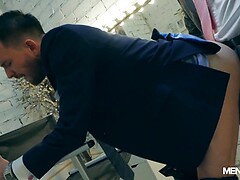 Tiny Innocent Boy can't Resist the Muscular Plumber and Eats him out before taking his Hard Cock